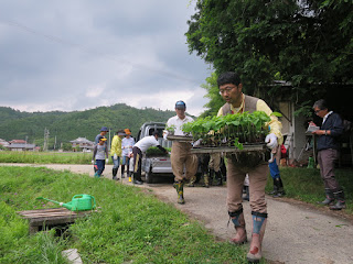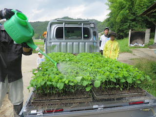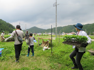 まず、ハウス内で育てられていた苗を畑に運びます。