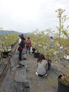 鳥の被害にあいにくそうな場所で、枝が横に広がって いたり、大きく育っている木が良い実がつきやすいと いう西田さんからのアドバイスを元に真剣に皆さん ご自分の木を選ばれていました。 |