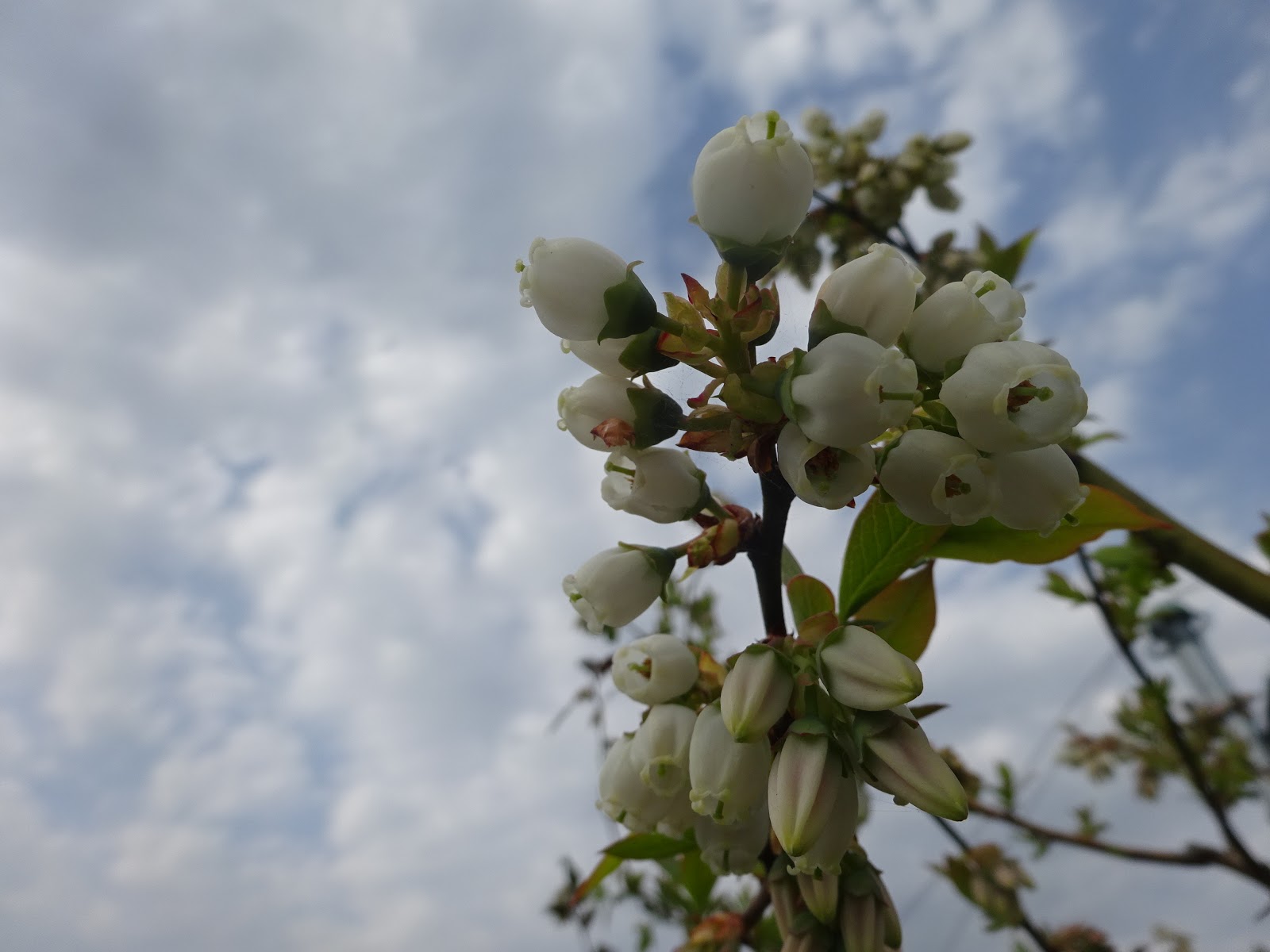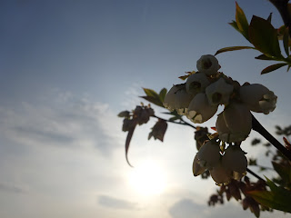 日が長くなりましたがもう夕方。 ブルーベリーの白い可憐な花がまた可愛い。 |