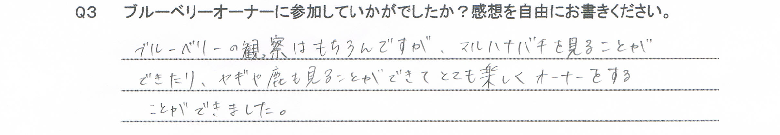 - ブルーベリーの観察はもちろんですが、マルハナバチを見ることが出来たり、ヤギや鹿も見ることができてとても楽しくオーナーをすることができました(たつの市 A.U.様)