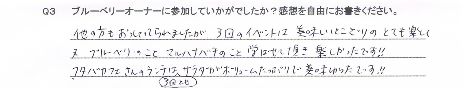 - 他の方もおっしゃられましたが、3回のイベントは美味しいとこどりのとても楽しく又ブルーベリーのこと、マルハナバチのこと学ばせて頂き楽しかったです!!フタバカフェさんのランチは3回ともサラダがボリュームたっぷりで美味しかったです!!(西宮市 K.M.様)