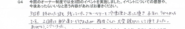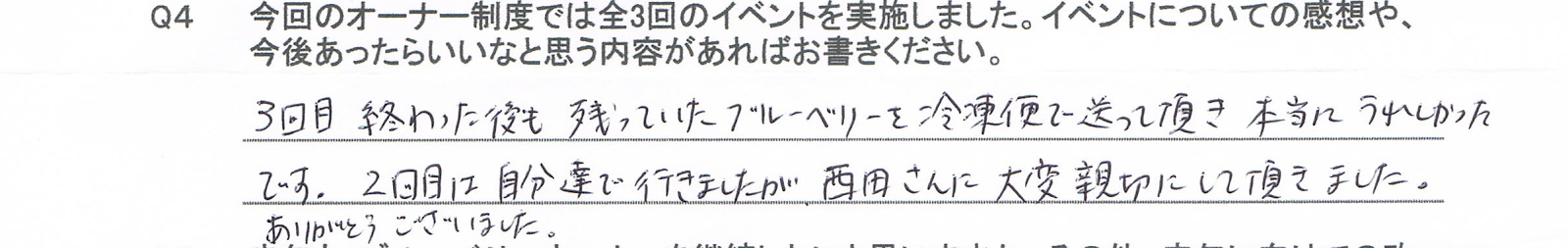 - 3回終わった後も残っていたブルーベリーを冷凍便で送って頂き本当にうれしかったです。2回目は自分達で行きましたが、西田さんに大変親切にして頂きました。ありがとうございました。(西宮市 K.M.様)