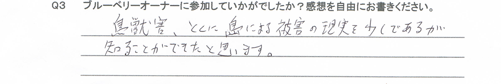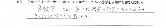 - 鳥獣害、特に鳥による被害の現実を少しであるが知ることができたと思います。(大阪市 Y.H.様)