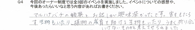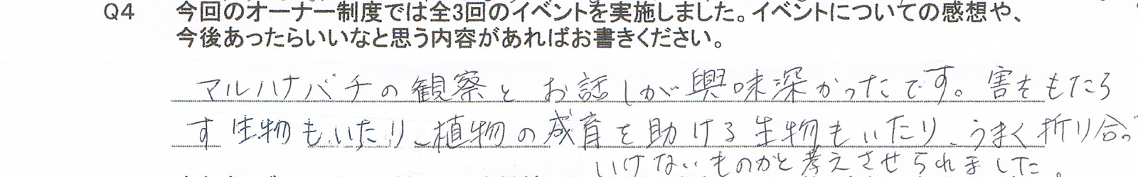 - マルハナバチの観察とお話しが興味深かったです。害をもたらす生物もいたり、植物の育成を助ける生物もいたり、うまく折り合っていけないものかと考えさせられました。(匿名希望様)