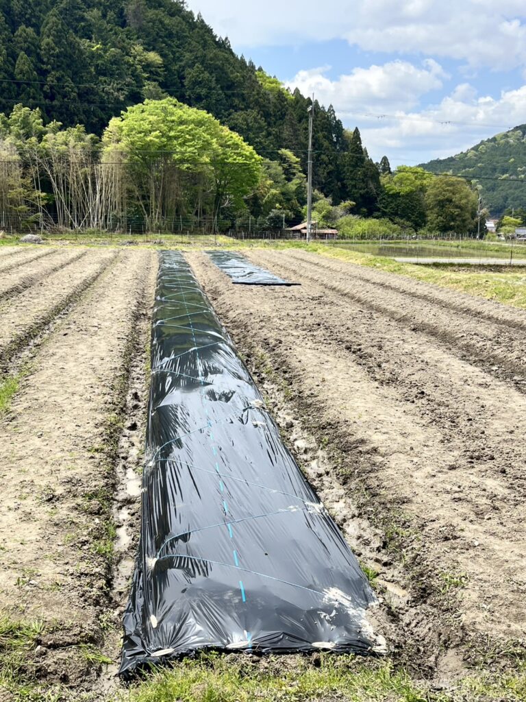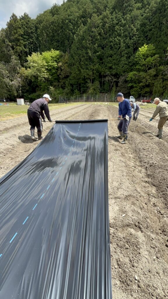 黒マルチは風で飛ばされがちですが、初参加の方のご提案で、ロープを張り強度を持たせました。