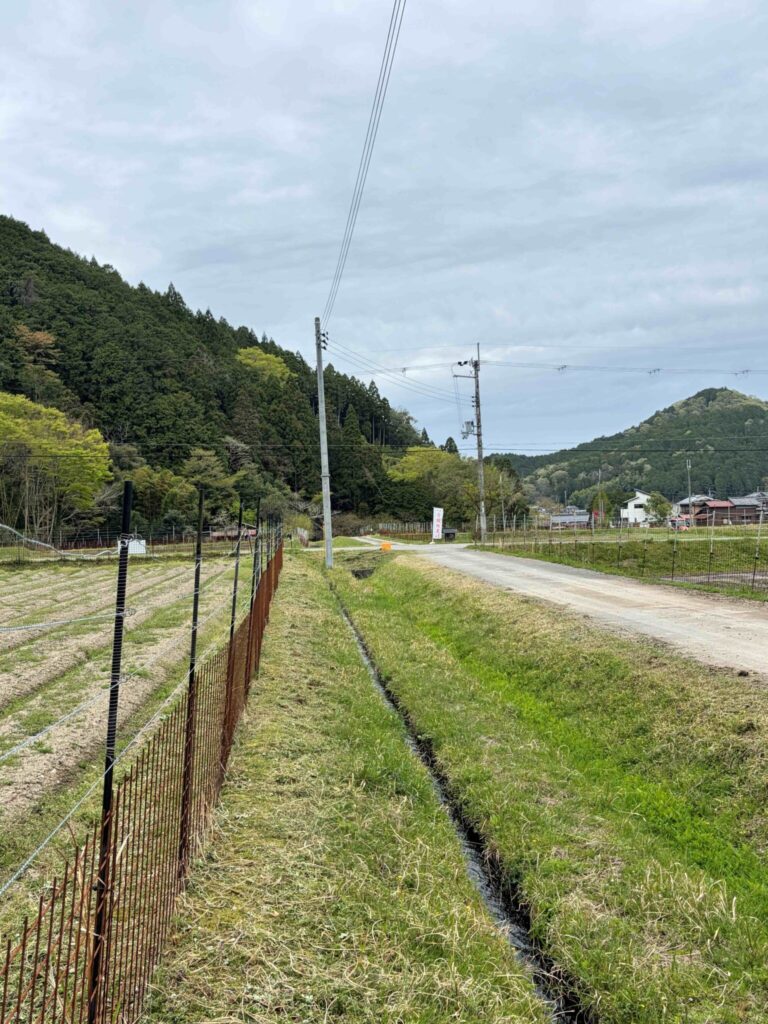 電気柵の外周の草刈りについては、付近に水路が通っているために、水路に刈り取った雑草が落ちて詰まらないよう手箕(てみ)を使ってカバーしました。