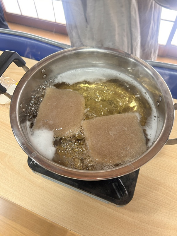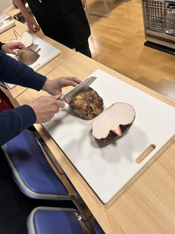 こんにゃく作りは、地域の蒟蒻芋を栽培されている方から声をかけていただき、イチからのこんにゃく作りに挑戦しました。