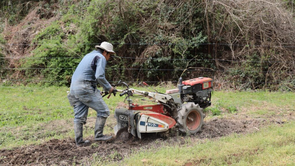 夏野菜の植え付けのために、耕運機でどんどん畑を耕していきます。